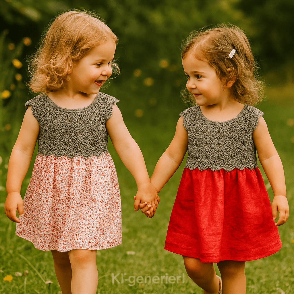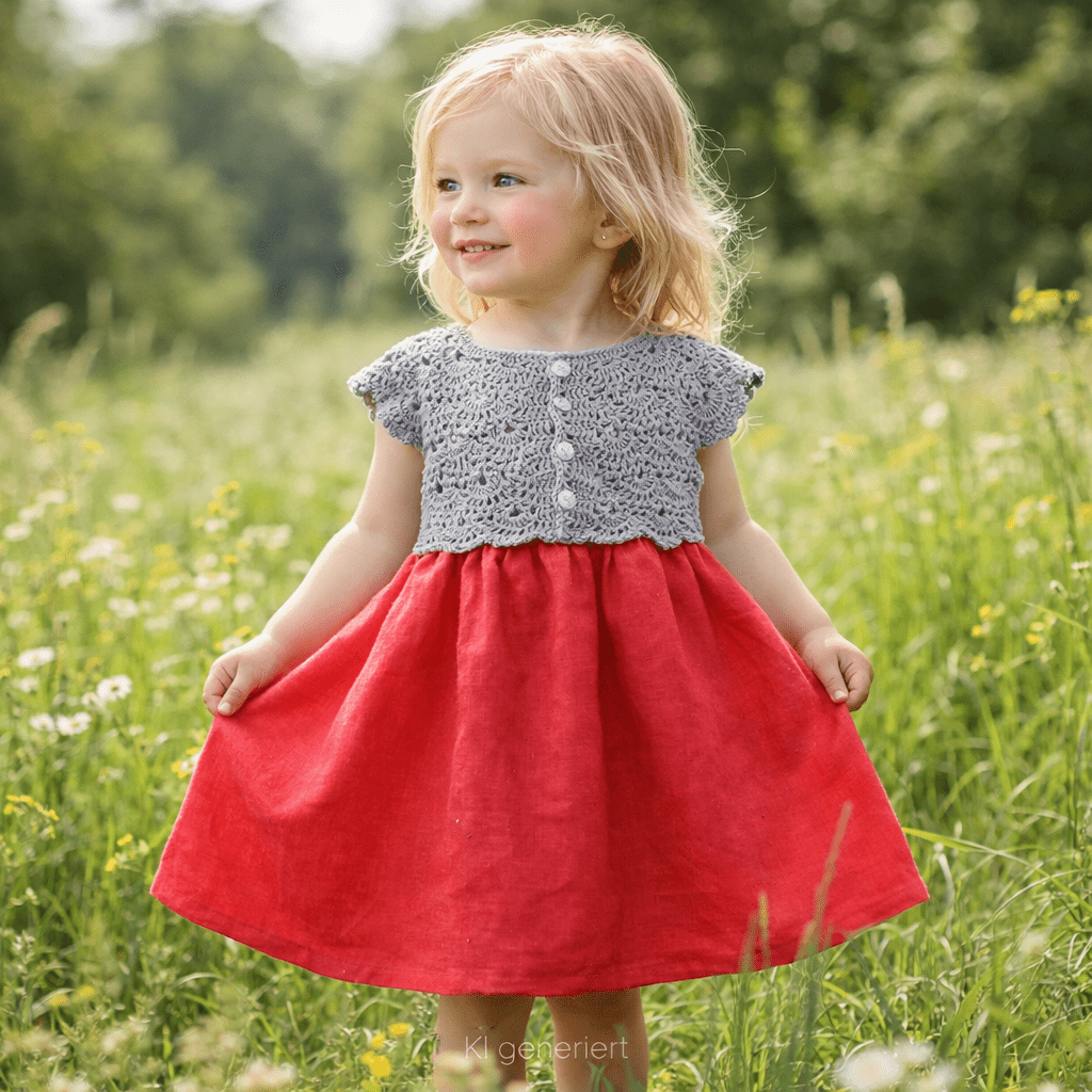 Dieses einzigartige Kinderkleid kombiniert zarte Handarbeit mit liebevoll ausgewählten Stoffen – ein echtes Lieblingsstück für besondere Momente.
